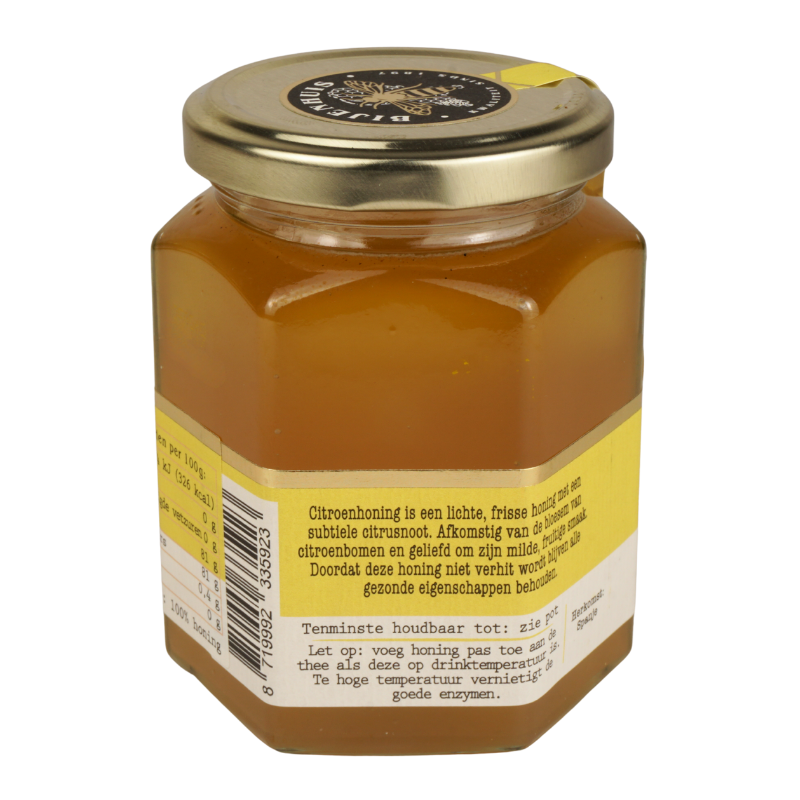Een heerlijke frisse, fruitige honing afkomstig van de citroenboom. De citroenboom bloeit vier keer in het jaar. De honing zelf is niet zuur, maar friszoet. Onze citroenhoning komt uit Spanje.